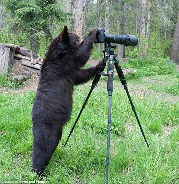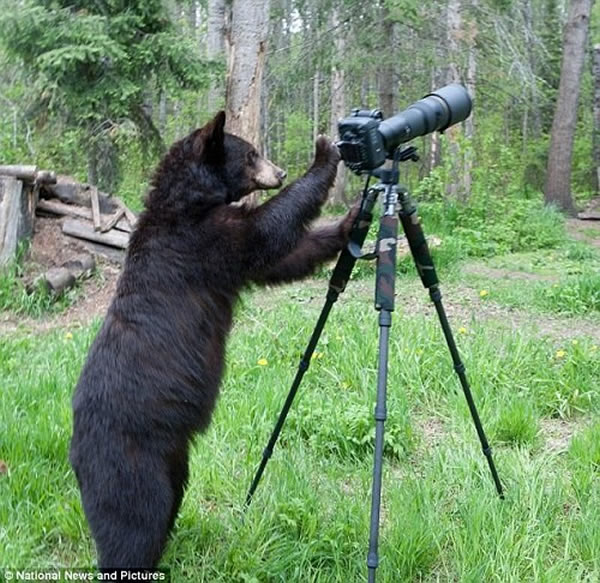 照片中,这只好奇的黑熊像摄影师一般摆弄相机,并通过相机的取景框观察四周环境。最后,直到不小心碰倒了三脚架,这只有摄影潜质的熊才恋恋不舍地离去。