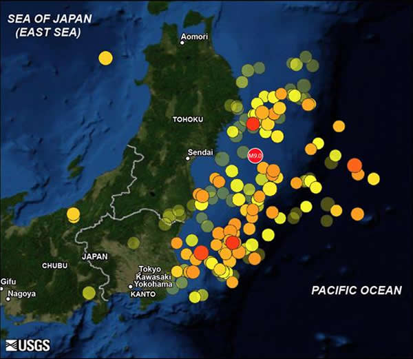 此地图显示了2011年3月11日日本东北地区发生的9.0级主震,以及震级为5.5的166次余震。