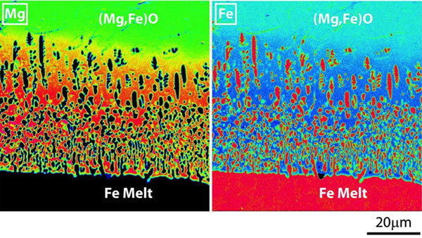 他们对这起意外事故进行了模仿实验,最终发现融化的铁与高压高温环境下核幔边界的镁铁氧化物晶体有关系。在几分钟的时间内,富含铁的液体斑点迅速的渗透到晶体内100微米处——也就是人类头发的平均宽度。研究人员认为,这种渗透率是由镁铁氧化物晶体内氧化铁的浓度决定的。晶体里的氧化铁越多,铁元素渗透的速率越快。