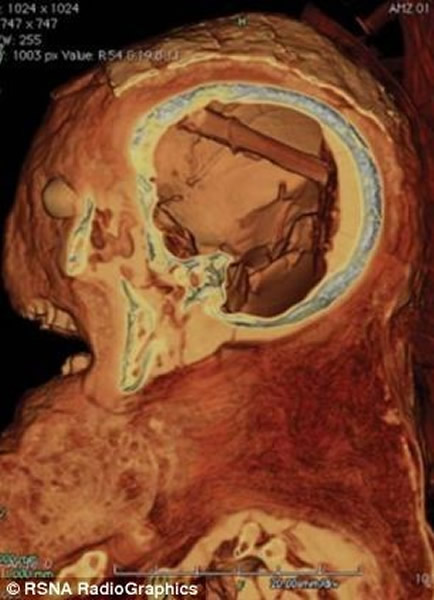 据报道,这个一度令科学家们感到困惑的工具长约7.5厘米,它被插在死者头骨的左顶骨和后部骨头之间。这具木乃伊距今已有2400年,其身份是一名40岁左右的女性。