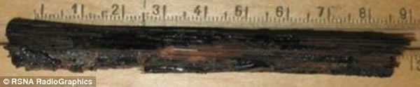 研究人员使用内窥镜将这个小木条取木乃伊头颅中取出