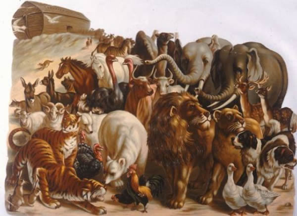 16世纪的一幅壁画,上帝命令诺亚从每种动物中挑出一公一母装上方舟,躲避大洪水