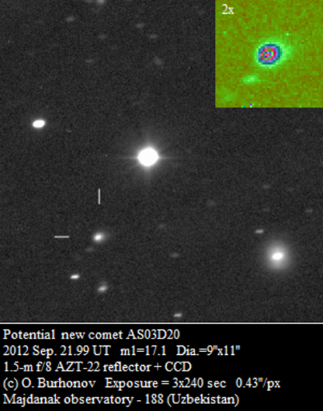 另一颗彗星名为C/2012S1(ISON)。这颗彗星被不少人誉为是自百武和海尔波普彗星后又一颗可以震撼人心的彗星。根据目前的观测情况,到2013年11月这颗彗星将肉眼可见,最亮的时候甚至可以超过月亮的亮度。只是这个时候它距离太阳很近,很难被观测到。对于北半球的天文爱好者来说,11月至12月的清晨是搜寻这颗彗星的机会,到12月中旬,这颗彗星将在清晨从东方地平线上升起。如果一切顺利的话,届时市民可以观赏到一颗明亮的彗星。