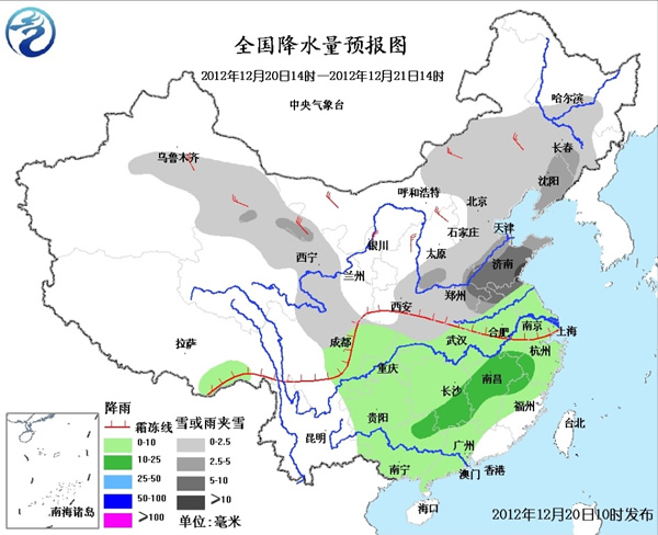 未来三天,南方地区持续阴雨天气,20~22日,江淮、江南、华南北部等地将有中雨。22日前后,江淮、江南北部和西部、贵州等地自北向南将出现雨转雨夹雪或雪,贵州中部部分地区有冻雨。