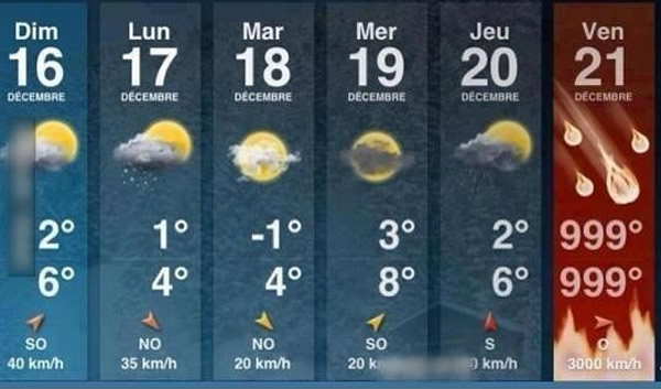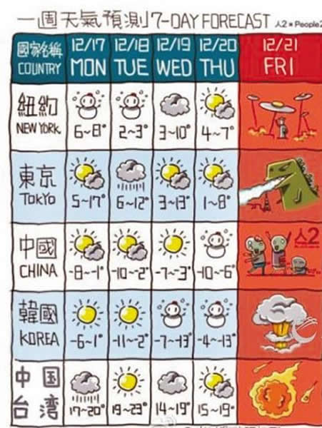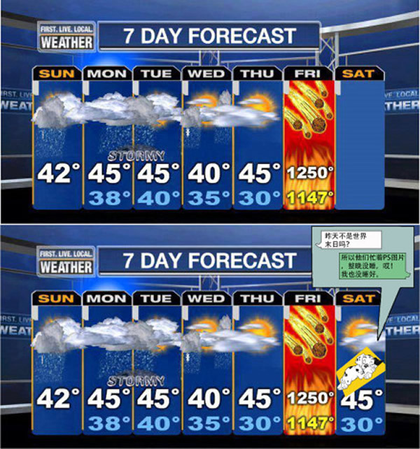 “下面一起来关注本周的天气情况,未来三天晴转多云偶阵雨。周五可热,天降异火,请把鸡翅刷好烧烤酱放在阳台上,大家注意防暑哦!”近日,一幅由网友恶搞的“世界末日天气预报”让人捧腹,上面显示,21日前的天气都相对正常,而21日当天的天气则染成了红色,并以数个火球坠楼作为背景,最低和最高温度都更改为999摄氏度。有网友戏称:“如果玛雅人靠谱,21日当天请卸下冬装,出门记得搽防晒。”