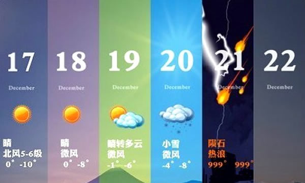 2012年12月21日,这个一直被谣传为玛雅人预言的“世界末日”的时间,近日不少网友也开始恶搞出各种稀奇古怪的“末日”天气预报对于这些恶搞,广州市气象局官方微博@广州气象昨日推出“末日”天气预报进行“反击”,预报上称,21日当天既没有火球也没有恐龙,只有一轮火红的太阳照常升起。