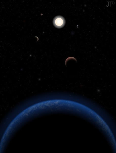 艺术家绘制的距地12光年鲸鱼座τ星拥有五大行星的情景