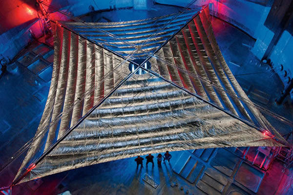 这是美国宇航局的李斯-约翰逊展示的可用于制造太空帆的新型材料,在太阳光或者激光的微弱压力下,太空帆能够完全展开,这种帆状材料像头发直径一样纤薄,能够反射光线。甚至充分展开时相当于一个小国家的面积。