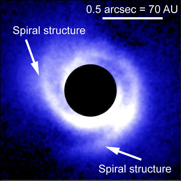 利用HICIAO拍摄到的环绕SAO 206462的星盘的图片。日冕仪阻挡了中央恒星发出的光线,在图中显示为黑色圆形区域。箭头显示了环绕恒星的旋臂结构的两只旋臂。