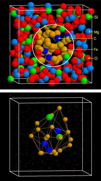 上图:地球形成早期模型图:汇集到地球上的物质在熔融条件下分成两相,铁进入地核,硅酸盐留在地幔。下图:希腊字母alpha形状的结构图:Fe原子位于alpha形状的表面,硅原子和碳原子在alpha形状的内部。
