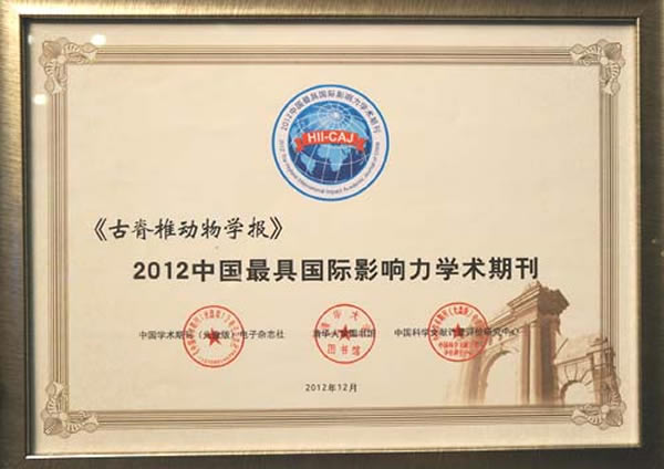 2012年12月26日,中国学术期刊电子杂志社、中国科学文献计量评价研究中心与清华大学图书馆共同发布了《中国学术期刊影响因子年报(2012版)》、《中国学术期刊国际引证报告(2012版)》(简称《CAJ-IF年报》和《CAJ国际引证报告》),并同时公布了2012“中国最具国际影响力学术期刊”名单,《古脊椎动物学报》顺利入选。在本次评出的175种科技类“中国最具国际影响力学术期刊”(SCI期刊87种,非SCI期刊88种)中,《古脊椎动物学报》综合排名第74位。在国际他引影响因子排序上,位列第59位,超过了多数国内SCI刊物。