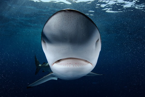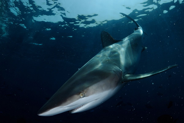 一头巨大的丝鲨游荡在摄影师正上方