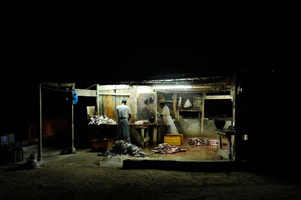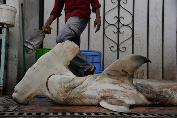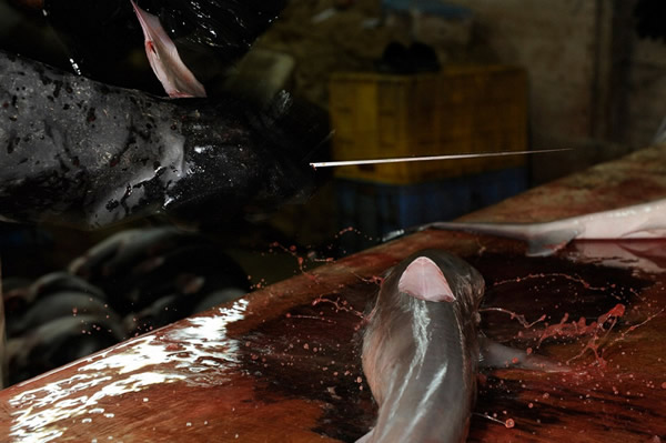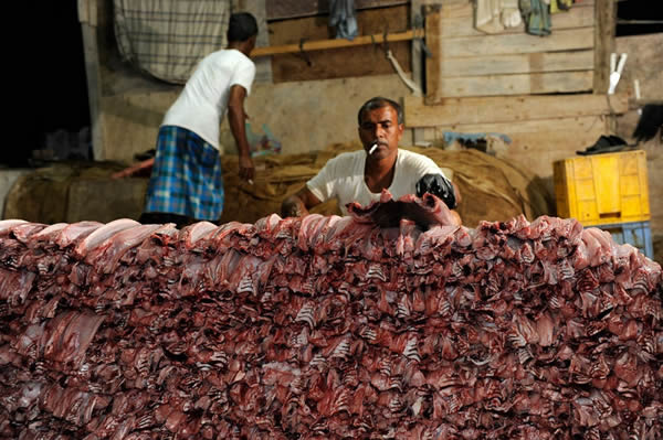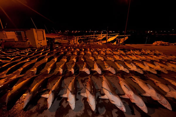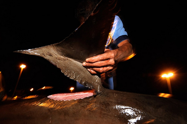 每当满载双髻鲨、丝鲨、长尾鲨的捕鱼船在海港靠岸后,工人们便会将体型小的鲨鱼会被转到另一艘船上,而体型大且价值高的鲨鱼,如虎鲨等则会被巨大的鱼钩刺穿然后拖至夜间拍卖场。紧接着便是另一艘捕鱼船靠岸,重复着前面的流程,如此周而复始,仅一夜这里就会有1000头鲨鱼被出售。这些整齐地摆放在拍卖场里鲨鱼,它们耸起的背鳍犹如墓地的墓碑一般,无声地诉说着自己悲惨的故事。
