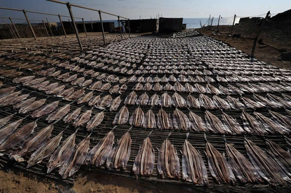 鲨鱼肉被置于烈日下烘干。