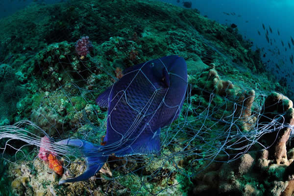 在阿曼达曼尼亚特群岛(Damaniyat)的珊瑚礁中,一些鱼类被困在废弃的刺网中动弹不得。