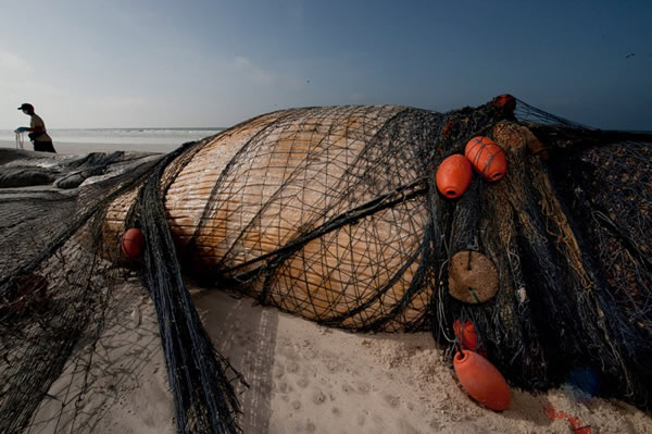 一头鲸鱼被死死地缠在刺网之中。