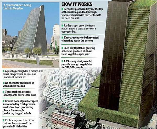 在瑞典林雪平地区,Plantagon公司正在建造一个54米高的大楼,到2014年,该大楼将生产一系列的多叶绿色蔬菜,其中包括:莴苣、菠菜和芥菜。现在鸟眼公司正在研究垂直农场水耕系统的可行性,计划在德文郡佩顿动物园内建造廉价的蔬菜农场,为动物提供食物。植物将放置在盘子中,伴随着每天太阳光线的移动而由传送带移动,保证接收到充足的阳光。