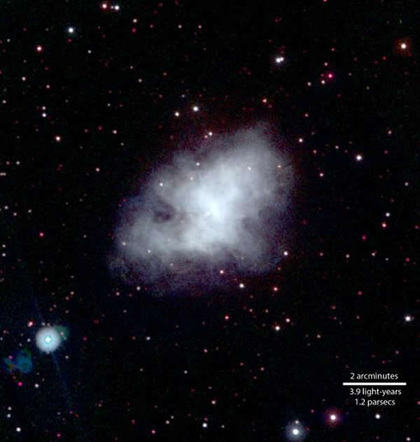 蟹状星云(Crab Nebula)是公元1054年一颗恒星发生爆炸形成的遗迹。这团膨胀的气体距离地球大约6500光年,居于金牛座方向。“紫外/可见光”望远镜是“雨燕”卫星上所搭载的3种望远镜之一,是唯一捕获与人眼所看到的光线类似的望远镜。虽然以地面望远镜的标准来看这是架小口径望远镜,但是它在伽马射线暴(GRB)爆发的初期能够做出最迅速的反应。