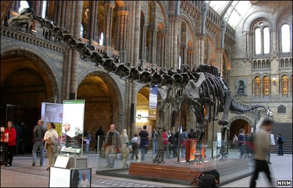 伦敦自然历史博物馆前厅里的恐龙多年来一直向前伸展着长长的脖子,欢迎博物馆的访客。