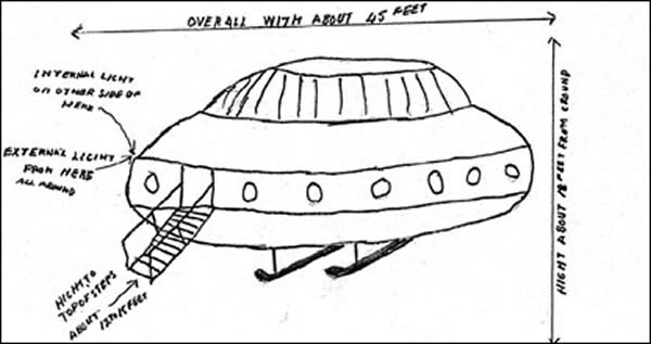 凌晨三点,一位妇女猛然惊醒,从卧室的窗户向外望去,一个巨大的碟形物体从眼前慢慢飘过,“它似乎没有任何动力。既不是推的,也不是拉的;不是提起来的,也不是托着的,运动中没有一点声音。”