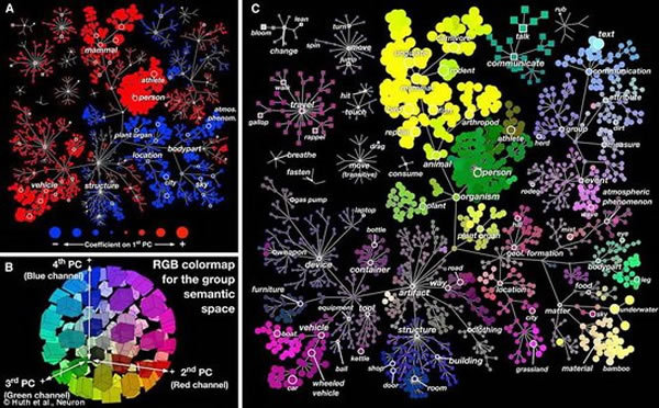 研究小组对5位研究员实验测试,当他们分别观看两个小时的电影视频时进行了功能磁共振成像。之后研究人员分析发现测试者大脑皮层3万个微小结构区域如何响应观看到的1700个物体分类。接下来,他们使用主成分分析方法,发现“语义空间”普遍存在于所有研究目标,该结果呈现在一个多色彩大脑结构地图上,显示了1700多种视觉类别,以及彼此之间的关系。