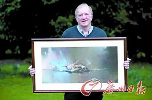 英国农场主坎道尔手持“喷火”式战机画像。5日,坎道尔率领一支寻宝队启程前往缅甸,寻找可能在第二次世界大战末期埋藏在地下的数十架“喷火”式战机。