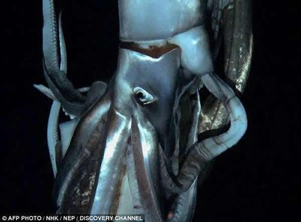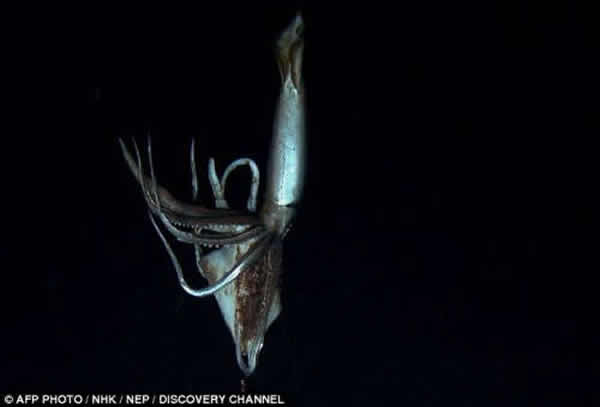 这是世界上首次在深海拍摄到大王乌贼的动态影像。之前,在1965年,曾有一名捕鲸人称目睹一只大王乌贼和一头重40吨的抹香鲸在海中搏斗的景象。