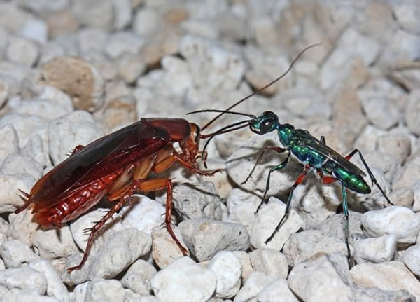 如果蟑螂会做噩梦的话,绿宝石蟑螂寄生蜂在其中肯定占据一个重要的位置。这种色彩丰富的微小寄生蜂会用蜂刺刺美国蟑螂两次,一次在上腹部来阻止它们跑掉,第二次直接刺中大脑来让它变得迟钝。随后寄生蜂就会拖动蟑螂的触须把它拖到一个隐秘的角落,然后在蟑螂身上产卵。