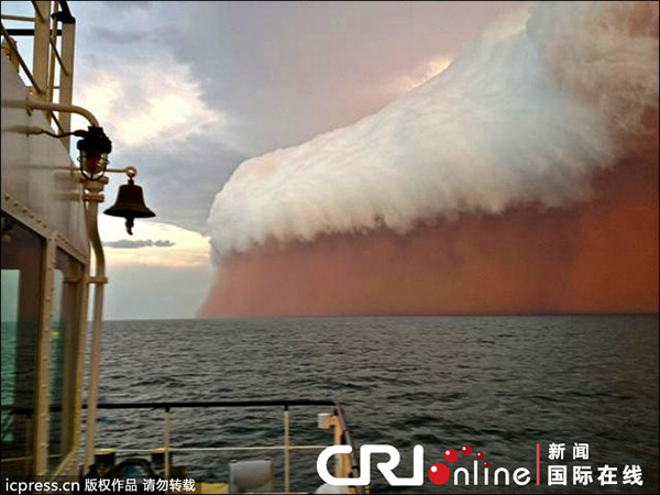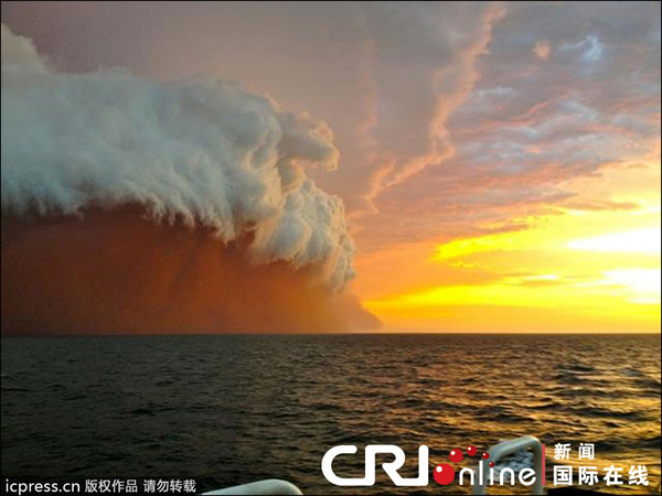 澳大利亚海面上惊现红色沙尘暴 来源: 蜘蛛网 时间:2013年1月12日 10:30 澳大利亚海面上惊现红色沙尘暴 澳大利亚海面上惊现红色沙尘暴 当地时间2013年1月9日,澳大利亚,龙卷风到来之前,海面上惊现红色沙暴,这一恐怖场面是拖船工人Brett Martin在25海里之外的昂斯洛镇拍下来的。 Brett MARTIN/东方IC 上一篇 下一篇 TAG: 澳大利亚 沙尘暴