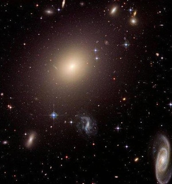 这是哈勃空间望远镜摄于2006年的影像。显示的是一个包含了各种星系的星系团,其中就有一个明亮的椭圆星系。