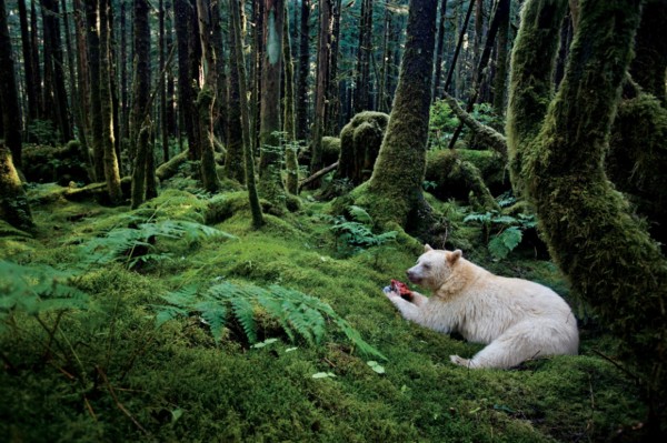 在长满苔藓的雨林中,黑熊也穿上了白衣。柯莫德熊是美洲黑熊的一个亚种,具有一身白色毛皮,被土著居民称为“灵熊”。