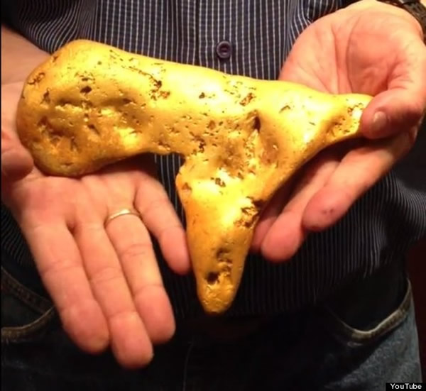 据称,当时这名勘探者听到探测器发出微弱的警报,然后就地拨开地上的落叶展开挖掘,刚看到时他只是以为这是一块金色的汽车部件,直到把整个金块挖出来他才认识到这是一块巨大的大金块。