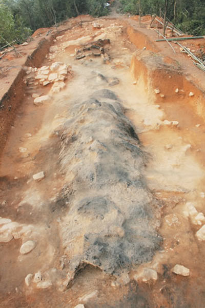 无论是两面坡人字形双层结构的木室、白膏泥的使用、木室顶部铺设树皮以便防水的设施,还是经过夯筑分层明显的高大封土,印山越王陵埋葬制度的许多内涵都可以从D30M1中找出其线索。值得注意的是,D30M1南部墓底还发现开凿基岩的现象,这或许是墓葬向地表以下开挖墓坑最原始形态的表现。