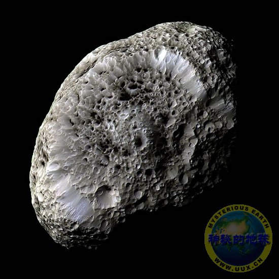 土星的卫星Hyperion是在一个翻腾的轨道中运行的一个形状不规则的天体,看起来有点奇怪:当“卡西尼”飞船于2005年9月掠过该天体时,发现它有一个独特的海绵质表面。“卡西尼”飞船所获得的初步结果。首先,成像和了射电数据表明,海绵外表是由一个多孔天体被碰撞造成的。因此,以前声称海绵质表面是由与冰川上所发生的因来自阳光的热量积聚而使冰川表面凹陷加深的类似过程造成的观点就站不住脚了。第二,近红外和紫外线光谱显示了覆盖该天体大部分表面的高反照区域的表面组成的细节,也显示了低反照区域(大部分在碰撞坑的底部)的表面组成的细节。所获光谱与存在被一种有机固体物质污染的水冰的猜测是一致的。低反照材料在光谱属性上与在土星的另外两个卫星(Iapetus 和 Phoebe)上所发现的物质类似,含有水冰、复合有机物、二氧化碳和腈的混合物。这种混合物与彗星中的物质、很可能也与柯伊伯带天体中的物质相似。