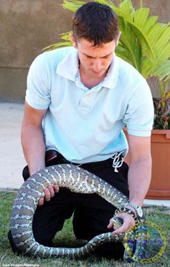 在澳大利亚北部的热带地区,当8周大的小斑猫科尔在自家花园玩耍时,突然被一条爬行的巨蟒抓住。等到14岁的塔拉•麦克拉伦跑进花园来给心爱的宠物喂食时,她发现这条巨蟒“大腹便便”地躺在地上。尽管小斑猫科尔的头骨是这只5英尺长的巨蟒的3倍,但是巨蟒照旧能够在用身体死死圈住猎物后,撑开下颚张大嘴巴将其整个吞下。其它3只小猫和5只成年猫无法停止它们的拯救攻击行动。