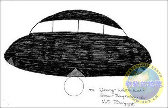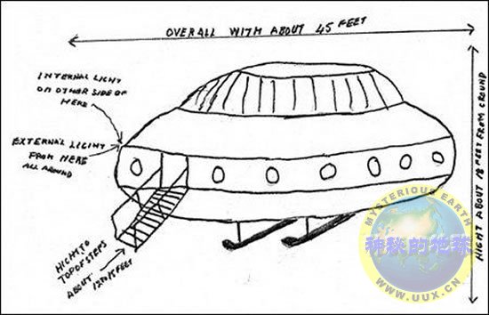 图为根据一名78岁老人描述的过程绘出的不明飞行物草图,他自称1983年时曾被带上不明飞行物。