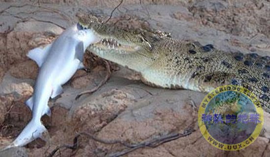 一只咸水鳄和一条鲨鱼在澳大利亚北部狭路相逢,展开了生死肉搏,最终鳄鱼技高一筹,美美地享用了一顿鲨鱼大餐。澳大利亚捕鱼爱好者保罗·范·布吕根目睹了这非同寻常的一幕,并拍下了珍贵的照片。