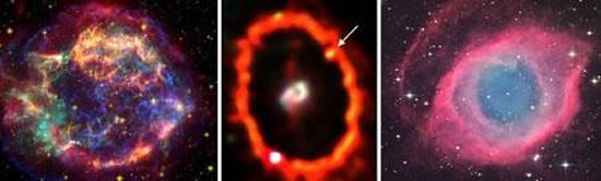 银河系中一些光环和球体。从左到右,(1) 来自古老的超新星残骸仙后座A的光回波;(2) 来自超新星1987A爆炸的冲击波;(3)名为旋涡星云(Helix)的行星状星云。SGR 1900+14周围的光环同上述几个图像均不相同。