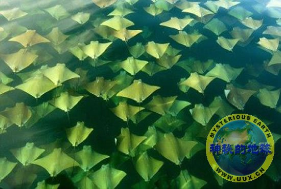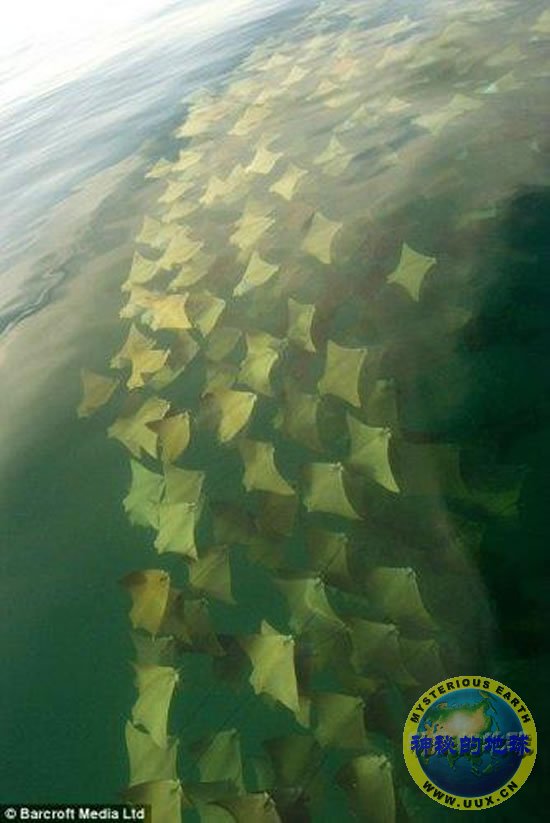 一位名叫桑德拉-克里特利的美国业余摄影师恰好见证了这一奇特的壮观景象。当时,桑德拉正在跟随费城鲸鲨科考队途经墨西哥湾尤卡坦半岛的北部地区。看到这些叶片状的动物,桑德拉的注意力立即被这种通常被叫做“金色光芒”的鱼吸引了过去。“这简直是不可思议的景象,难以用语言来表述。整个水面覆盖着一块色调温和、图形各异的图案,好象一个漂亮的活动床板,随风向前缓缓移动。任何人都难以忘记。我在全球各地旅行,但从来没有见过如此壮观的景象。”