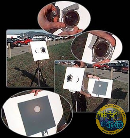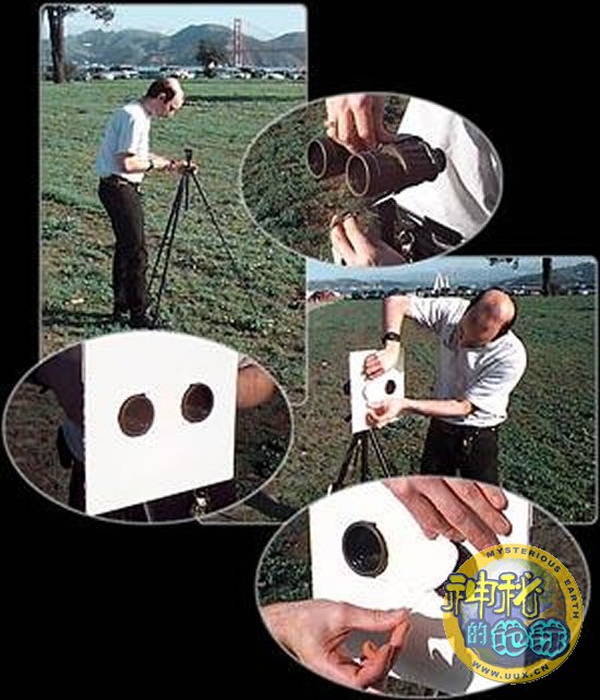 通过第一种方法形成的针孔图像非常小,而且模糊不清。我们可以通过一对双筒望远镜进行光学投影。注意:不要直接使用双筒望远镜观看日全食!