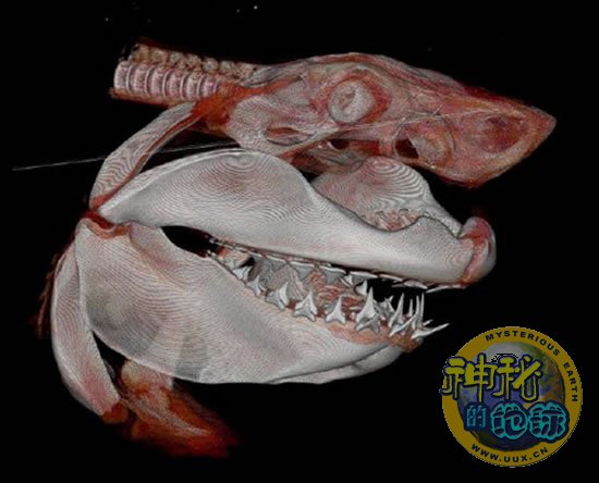 图为大白鲨的CT扫描图,下图为数字重建的大白鲨。