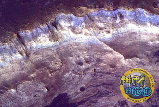 火星马沃斯山谷附近的一个环形山岩壁上暴露出的岩层