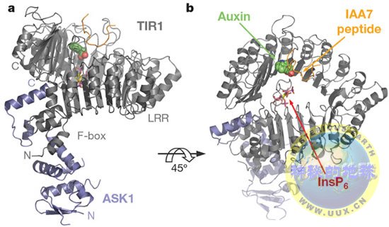 植物激素茁长素调控植物生长的机制自达尔文时代以来就一直困扰着科学家。茁长素已知通过结合TIR1(transport inhibitor response 1)受体和通过依赖于泛素(ubiquitin)的Aux/IAA抑制蛋白的降解来调控基因表达。现在,TIR1在与三种不同的茁长素和一种Aux/IAA肽形成的复合物中的晶体结构的确定表明,茁长素起一种“分子胶”的作用,促进受体和作为降解目标的蛋白质间的相互作用。除了揭开茁长素调控机制的奥秘之外,这项工作还首次建立了一种植物激素受体的结构模型。更碰巧的是,一个像茁长素这样的小分子调控泛素连接酶的方式,能让科学家找到开发治疗与泛素连接酶缺陷有关的人类疾病的一个新颖策略。