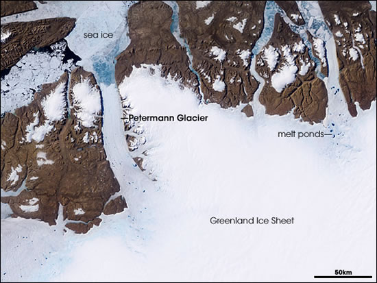 俄亥俄州大学一位研究人员贾森-博克斯(Jason Box)指出,“如果彼得曼冰山的裂缝向上游蔓延,届时整个冰塌的面积会有160平方公里。这将是整个冰原面积的三分之一”。研究人员表示,由于气温变暖,冰山移动及融化速度加快,这导致格陵兰岛的冰山崩塌融化,向大西洋倾注的冰量是5年前的两倍。这种现象意味着,海平面上升的速度比人们预想的要快。对此,英国剑桥大学斯科特极地研究院的朱利安-道兹威尔(Julian Dowdeswell)认为,“ 这种变化表明,目前人们对未来海平面上升情况的估计太微不足道了。格陵兰冰盖的面积约为170万平方公里,厚度为3公里,如果它完全融化,那么海平面将被抬高7米”。