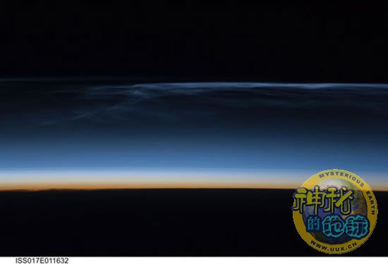 据美国宇航局太空网9月2日报道,2008年夏季,在国际空间站上工作的宇航员观看到一个奇妙而怪异的现象——薄薄的蓝色云层悬浮在地球大气层与太空间的分界线上。闪闪发光的蓝云照亮了夜空——也被称之为夜光云——距地高度大约在47英里到53英里(76公里至85公里)之间,在这一高度,流星和明亮的极光非常少见,大气层的颜色也只能“让位”于太空的黑色。