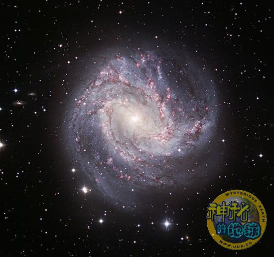 据专家介绍,从某些方面来说,梅西尔星系83星系是我们银河系的缩小版,该星系中心位置由大量恒星聚集着,这些恒星密密麻麻的分布在星系表面。科学家们腊希拉(LaSilla)天文望远镜所拍摄下的这些绚丽图像,生动的显示着无数耀眼夺目的红色宝石在不断的向外放射着光芒。事实上,这些红宝石是由巨大发光赤红的氢气体云团构成的。专家们解释道,新生成的恒星会放射出无数紫外线射线,这些紫外线射线会将这些云团中的氢气体进行电离,从而使得这些气团炽热发光,放射出红色光芒。虽然在星系的中心位置有许多由年长一些的恒星会发出黄色光芒,但在这些强力赤红光芒的映衬下,黄色光芒就会显得微不足道。此外,这些红色光芒与黄色光芒交相辉映,红色与黄色最终构成了现在这样的红色偏紫色的外观颜色,成为别具一格的红宝石颜色。更具动感色彩的是,图片中也清晰的显示出黑色盘旋的尘埃流划过的痕迹,为整张图片效果增加了美丽元素。