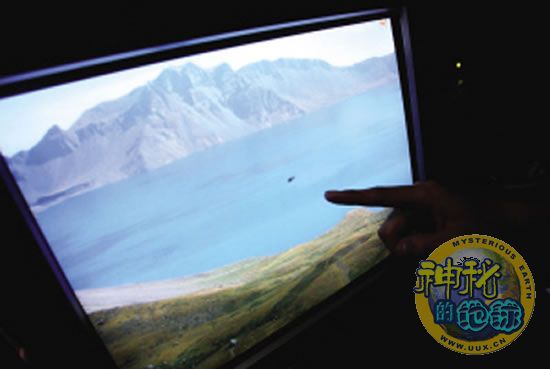 回到家中,一家人都争着看他们旅游的照片。看着看着,家人突然发现一张照片与众不同,这张照片拍摄的是天池的景色,其他照片的天池湖面一片湛蓝,而这张照片中的湖面有一块弧形黑斑,在电脑上放大来看,黑斑呈弧形。“这不是天池的怪兽吗?”一家人惊呼起来。