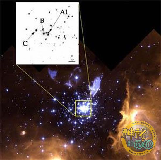 这个巨大的恒星系统被命名为A1,位于巨大星团NGC 3603里面(NGC 3630星云中的恒星是银河系中最大的恒星,其周围大量灰尘和气体是孕育这些恒星的摇篮。在NGC 3603星云内部,恒星呈现出不同成长阶段和体积,便于科学家分析这些恒星生命周期的不同历程。 NGC 3603星云距离地球2万光年,在其内核聚积着最大的恒星,通过对该星云的恒星的分析研究,可进一步洞察银河系内年轻星云的形成和进化过程),该恒星的自转周期为3.77天。组成这个巨大的恒星系统的星体数量相当庞大,且其发射出的光芒也相当明亮,因此只有沃尔夫-拉叶星(Wolf-Rayet star)可与之媲美,而后者是种很罕见的大质量蓝巨星,能发出时速高达数百万公里的恒星风,重装附近的打分紫云,产生形状复杂的星云和弯曲的弓形激震波结构,其发出亮度超过太阳亮度100万~1000万倍。同时,此次研究还在NGC 3631-A1附近探测出迄今为止在银河系里发现的能量最大的X射线。