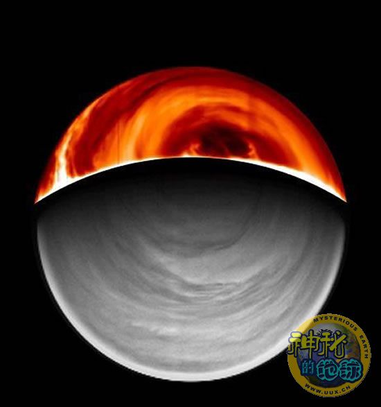 金星快车号探测器使用VIRTIS仪器呈现的金星大气循环情况,顶部是夜间红外线观测情况,底部是白天观测情况