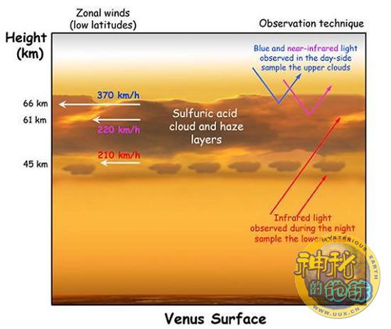 拉维加和“金星快车号”研究小组对金星41英里上空625个云层、38英里上空662个云层和28—29英里上空932个云层进行了跟踪性观测。在白天,一种叫做“金星快车视觉和红外线热成像分光计(VIRTIS)”的仪器观测了高空可见云层的移动状况,在夜晚,该仪器转换成为红外线光范围观测较低云层的变化情况。他们发现在金星表面上空41英里处风速接近于230英里/小时,28—29英里处风速接近于130英里/小时。在地球上,海拔18000英尺处风速能够达到100英里/小时,海拔30000英尺处风速能够达到200英里/小时。